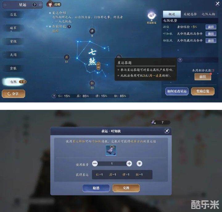 星运不够格的小伙伴可通过星运答题和好感度里的求运,改变自己的星运,大嘴巴百宝箱里都有相关的教程,建议自行模拟(不过这个需要时间,一时半会改变不了);
