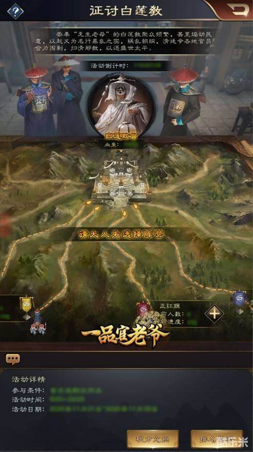 《一品官老爷》不久前发出了V2.7版本最新预告,两大全新活动曝光,其中【征讨白莲教/白莲争霸赛】需要玩家采取阵营活动的形式进行,联手对抗白莲邪教。玩家届时可以通过选择不同阵营,与同僚们一起攻打白莲教总舵,合力守卫《一品官老爷》的江山盛世太平。邪教不平,何以平天下,我朝土地不容邪教侵犯,肃清白莲教,刻不容缓!大家赶紧跟着小编看看【征讨白莲教/白莲争霸赛】该怎么玩吧!