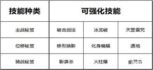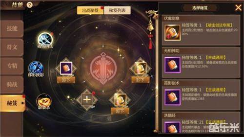 每种技能最多可装配4个秘笈进行效果强化,在出战秘笈界面可选择已领悟的秘笈进行装备。技能上不可装配不同类别的秘笈(例如主战技能上不可装配骑战秘笈),只可装备本职业专属秘笈或通用秘笈,非本职业专属秘笈不可装配。每个秘笈在装备后,即可获得秘笈装备效果以及秘笈装备属性加成,卸下后则失效。