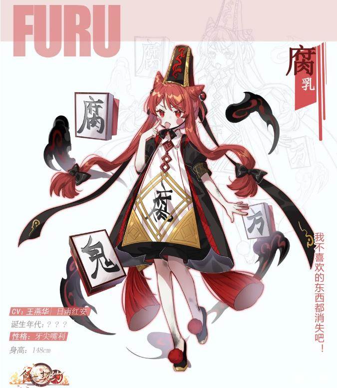 最后编辑于4年前食之契约游戏中的腐乳是一名即将新上线的R飨灵,腐乳是一位外表是个比较凶的小鬼女形象,性格十分活泼有些牙尖嘴利的小女孩儿。总是会站在自己的字块上来和猫耳朵比身高,会欺负人的活泼熊孩子。