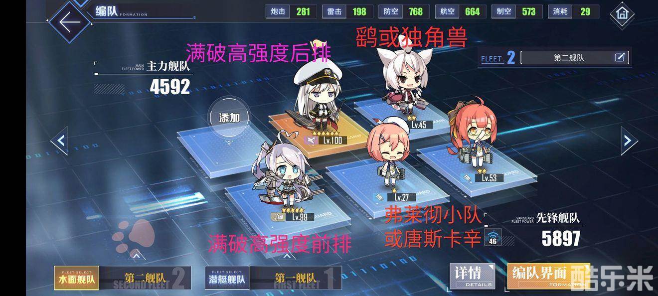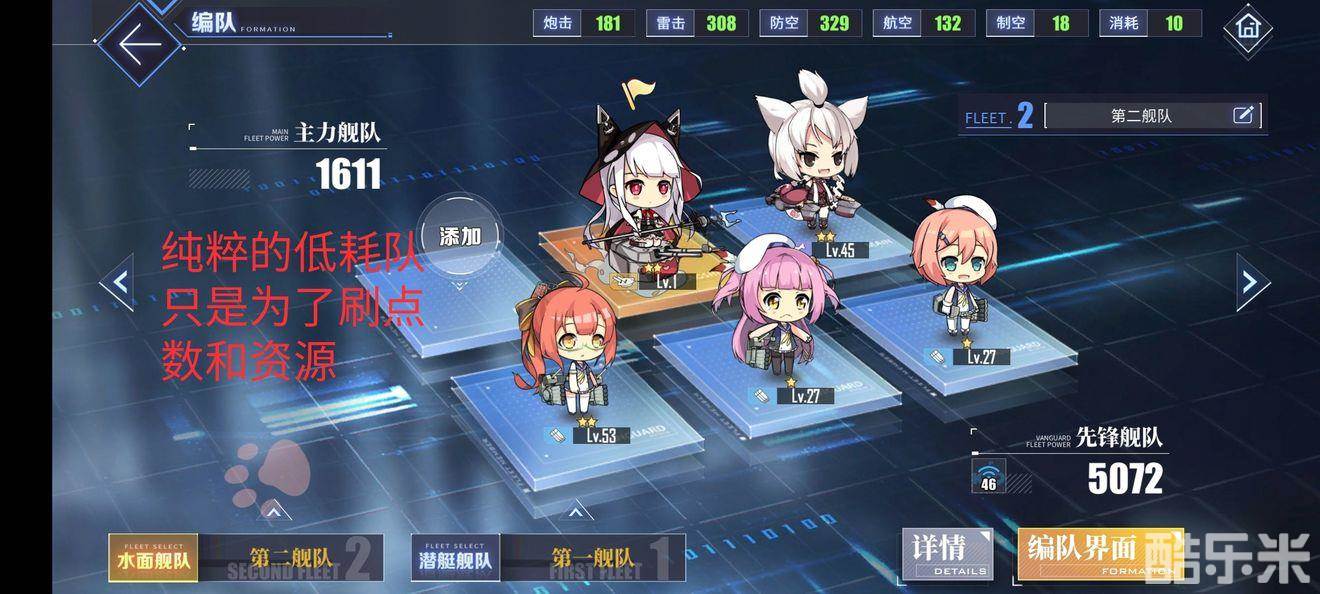 低耗队类型1:这种主要是已有两队可以通关活动图,不怎么喜欢练船,主要喜欢在活动刷点数和资源玩家的选择(120级船的一前排一后排的1+1阵容同理),弊端是亏经验,萌新别学,到时候连活动图都打不过。