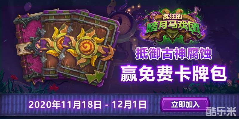 《炉石传说》全新版本“疯狂的暗月马戏团”现已隆重开幕:全新的版本带来了135张可收集卡牌,关键字“腐蚀”,上古之神的神器以及更多精彩内容。与此同时,即日起参与共同抵御古神腐蚀活动,还能赢取免费卡牌包。