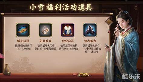 此外,小编还为勤政为民的大人,准备了貂裘暖耳、盘金端罩、锦衣狐裘等道具驱寒保暖。使用这些道具,能随机获得30-100政绩、30-60书籍经验、166-388元宝、还有1-3个书籍经验包或是1个出战令道具,贴心减轻大人的政务压力,还不赶快进游戏领取!