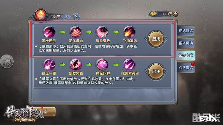 各位侠士在启用武学套路时可以看到,【峨眉素心】套路是以敌人受到素心的影响,从而使峨眉的伤害增加,并辅以变化多端的控制,来近身攻击敌人。