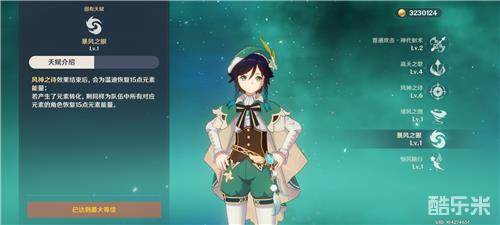 首先无限大招的必要条件之一,是将温迪的固有天赋【暴风之眼】点亮,当突破40也就是突破到60级的时候,这个天赋自然就会解锁。效果是大招结束后,恢复温迪15点元素能量。(PS:温迪大招需要60能量,15点相当于25%)