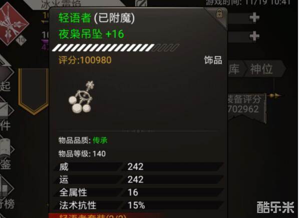 更正:感谢灯灯的指正,轻语者减暴击是进图减,不是面板直接减的,我最开始实验的是轻语者+披荆斩棘套装,当时没注意,后来把轻语者附魔无限平衡了,在有篇帖子中看到一个用轻语者+无限平衡的无命大佬通天塔过了169,他贴出来的面板属性中暴击率是64.7,所以就想当然的以为轻语者减暴击是面板直接减的,奇怪,现在再找那个帖子竟然找不到了,然后我重新附魔回轻语者,看了一下,发现是我错了,特此更正,附上截图