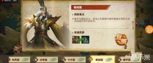 游戏中的演武场是属于游戏中的教学关卡,考验的是玩家对武将技能、兵种、站位的运用,而蜀国篇中所考验的就是武将的搭配和站位的选择了: