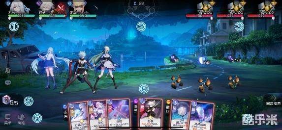 <战斗机制>以上为基础战斗界面,黑潮之上战斗模式为三角色出战模式,所有角色可分为守护系(盾)、战斗系(物攻)、能量系(法攻)、支援系(奶)四大职业,每名角色都有不同起源(燃烧、魂灵、光耀、海流、黑潮之光、黑潮之影、异界)。其次每名角色的卡组由专属牌(4张)+自选牌(4张)组成,自选牌战斗前可自定义搭配,玩家需自行选择不同职业属性角色+卡组出战,来挑战各种高难度关卡