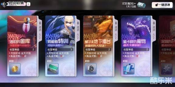 属于玩家日常培养角色的资源副本,通过通关不同的地图,从而获得不同的培养角色的必需资源。除了正常的通关副本获取资源,每周一、周五0点会额外提供军需配给。