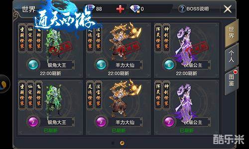《通天西游》BOSS系统是核心玩法之一,和副本、战场同为游戏三大基础战斗系统。其中BOSS系统分为:个人、世界、图鉴三类boss。