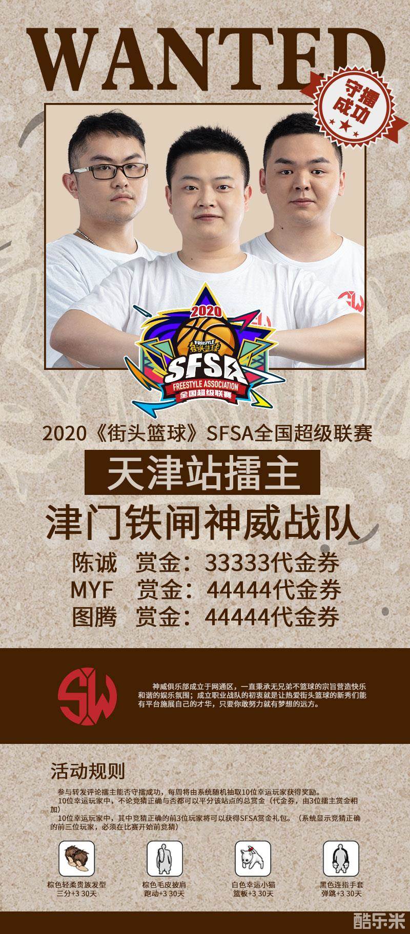 2020《街头篮球》SFSA全国超级联赛天津站第二天的比赛正式开战,天津的温度相比南方城市要寒冷不少,但玩家的热情却没有冷却,八强选手和参加2v2精英赛的选手都做好防疫措施早早来到现场准备迎接今天的比赛,最终经过这两天的苦战,天津地区赛冠军被魔兽、爆浪、刘洵获得,亚军和季军分别被豪神、破空、杨迁和三炮、小黑、武憨憨摘得。擂主神威战队绝杀天津冠军守擂成功,接下来让我们一起了解一下今天的比赛情况。