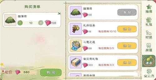 首先猫薄荷有两种获取途径,第一种是【商城购买】,道具列表中第一个物品就是猫薄荷,价格是58钻石一个,每日限购10个,换算成人民币就是5块8一个,价格比较贵不推荐平民玩家购买。