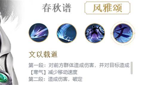 风雅颂偏向于控制,寒气的减速以及墨缚的禁锢都能起到很好的控制效果,冰冻更算的上是最强控制。该流派兼顾了输出和控场,攻击的距离也比春秋谱要元。