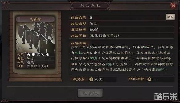 兵种适性较高的副将每回合造成伤害提高11%(可叠加);兵种适性较低的副将每回合为损失兵力最多的我军单体恢复兵力( 治疗率136% );