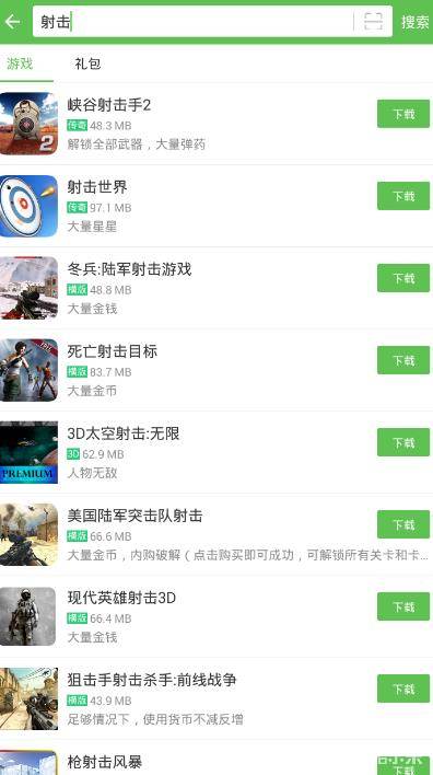 射击游戏呢?点击搜索看看!可以从下面的截图看到,射击关键字一搜索,就可以出来非常多的游戏,游戏特色都清晰的写在里面,什么解锁武器啦,解锁无限子弹啦~