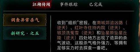 影之刃3玩家可以在江湖传闻里面,然后看到这个调查异常杀气的任务,这个到底是怎么开启的呢?毕竟任务描述让很多玩家都不知道怎么解开,下面小编就为大家带来解决方法。