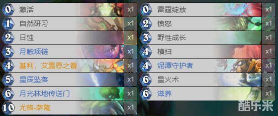 在前几轮没有跳费的情况下,前期技能打对面脸,然后技能横扫打脸,再接个日蚀月触项链/月火术斩杀对面。这套卡组很缺过牌,滋养大部分都是用做过牌。