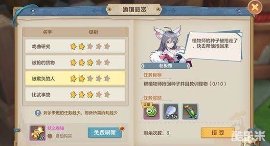 里面的喵布会给我们一些委托任务的,我们领取以后就可以做了,啥任务都有的,我们做完以后就可以得到很多的经验啦,还有一些钱,对我们的升级帮助还是很大的,难度也不是很高,都是蛮简单的哦。