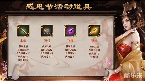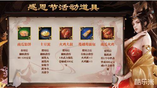 使用火鸡毛、火鸡蛋、火鸡腿和火鸡,即可使随机红颜增加亲密度。以上这些奖励都通过每日登录或是充值元宝获取,可不要错过咯。