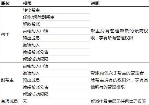 副帮主:由帮主任命,每个帮派可存在3个副帮主,副帮主职位不可自行转让;