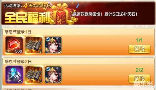 11月26日到11月30日期间,少侠每日登录游戏除原登录奖励外,还可额外领取1份感恩节回馈奖励!每天均有阿修罗绝学残卷、阿修罗觉醒石、流派古籍、聚星石、补天石等豪华奖励相送,只要连续登录即可领取!除了海量道具的赠送外,游戏中还有三位至尊侠客前来结交。