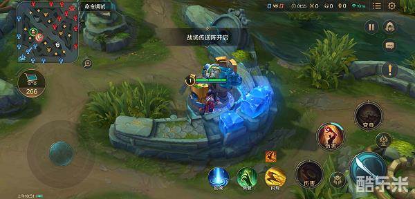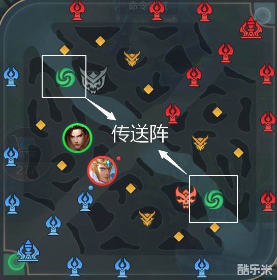 对局进行到1分55秒时,系统会提前5秒提示“战场传送阵开启”。传送阵将在2:00准时出现在上下路河道,并在地图上显示为绿色漩涡,每次使用传送阵都会有冷却时间,冷却时图标为灰色漩涡并附带倒计时数字读秒,冷却时两个传送阵均无法使用。(每个人独立计算冷却,任何人都只能看到自己的冷却时间,队友和敌方英雄的传送阵状态不可见)