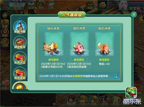 玩法介绍:活动期间登录游戏的玩家即可获得抽神兽资格,同一玩家只要满足对应条件可最多参与3只神兽的抽奖,3只超萌神兽等待幸运侠士的领取。