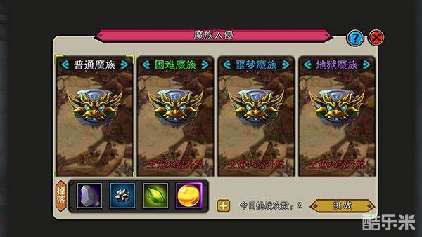 魔族,30级开放困难魔族,45级开放恶梦魔族,60级开放地狱魔族,难度越高获得的奖励越丰厚!