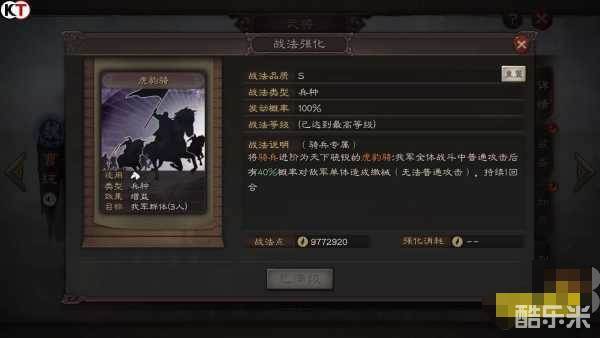 满级效果:将骑兵进阶为天下骁锐的虎豹骑,我军全体战斗中普通攻击后有40%概率对敌军单体造成缴械(无法普通攻击),持续1回合。