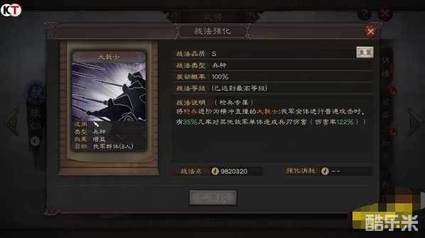 满级效果:将枪兵进阶为横冲直撞的大戟士;我军全体进行普通攻击时,有35%几率对其他敌军单体造成兵刃伤害(伤害率122%)
