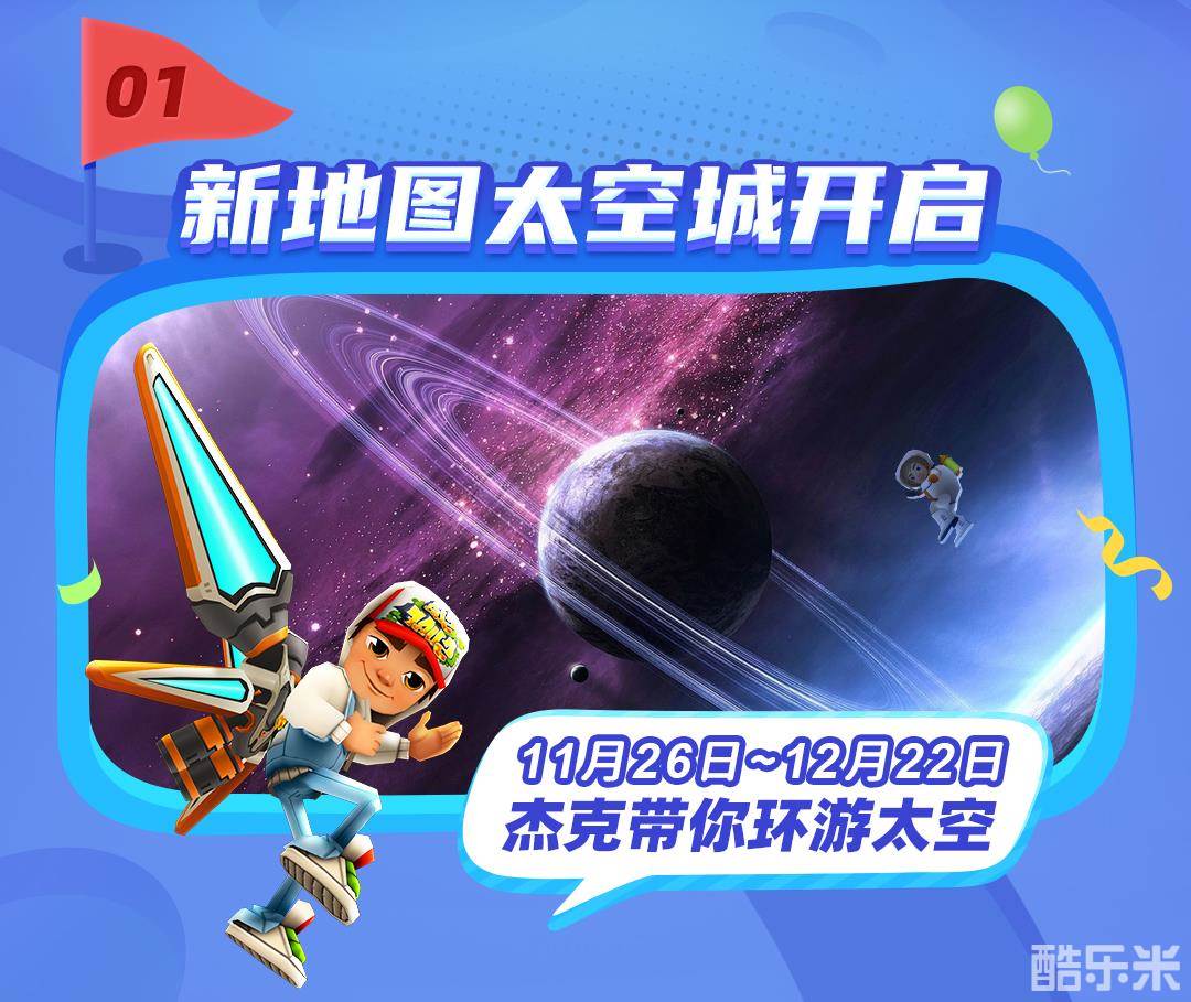 除此之外,还有专属角色太空人、专属飞船滑板和背饰等你来拿!这一切尽在《地铁跑酷》周年庆版本——太空城!一起来参与星空跑酷嘉年华吧!