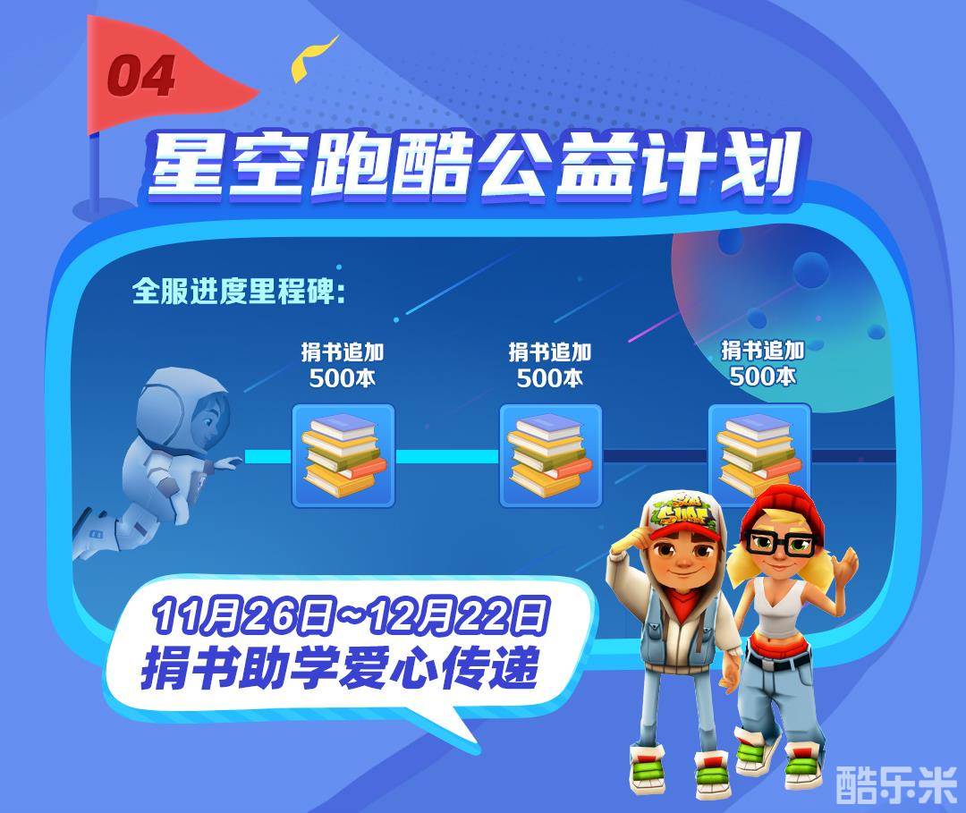 你玩游戏,我们捐书!你寄卡片,我们送礼!限定角色,公益专属头像框等你来拿!玩的越多帮助的学生就越多!这个周年,请和我们一起,为了渴求知识的孩子,一起成为星空跑酷捐书人吧!