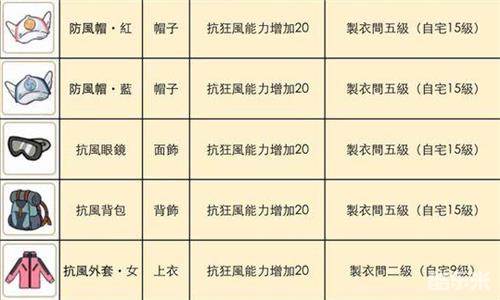 另外木灵峡谷部分地区还有狂风,就需要穿增加防风属性的服装。制衣间两级穿的都是防风外套和防风裤,5级后可以穿防风帽、抗风眼镜、抗风背包。