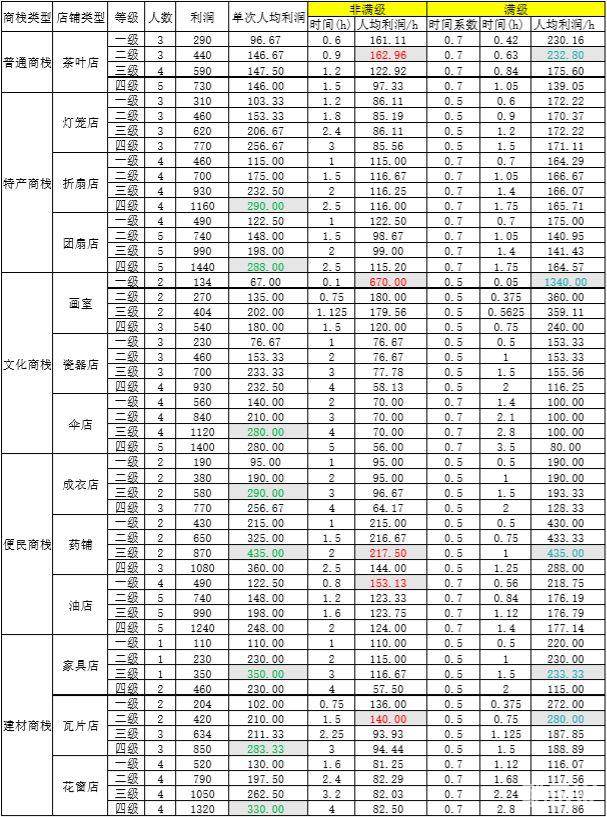 满级情况下,每小时人均利润最高的前五种店铺分别为: