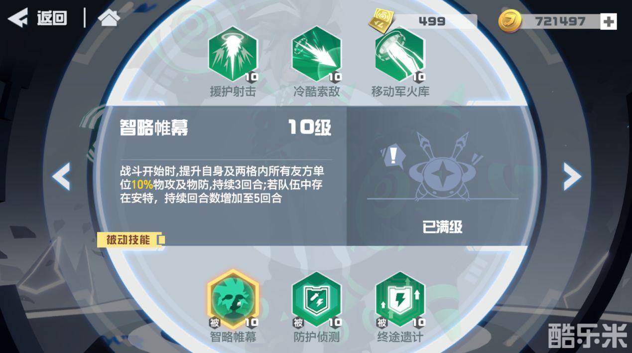 战斗开始时,提升自身及两格内所有友方单位1%(10%)物攻及物防,持续3回合;若队伍中存在安特,持续回合数增加至5回合