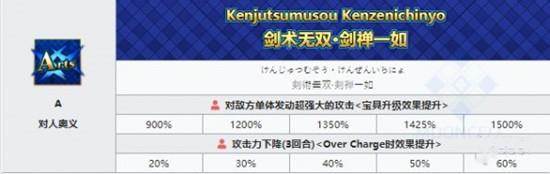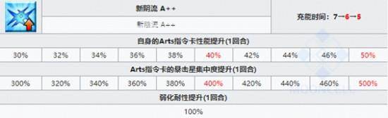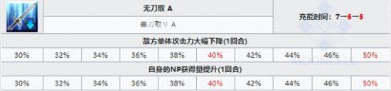三技能效果为降低敌方单体30%~50%攻击力1回合,提升自身30%~50%NP获得量1回合,充能时间7~5回合。职阶技能【对魔力】自身弱化耐性提升15%,【骑乘】自身绿卡性能提升8%。
