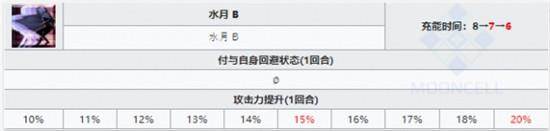 二技能效果为赋予自身回避状态1回合,提升自身10%~20%攻击力1回合,充能时间8~6回合。