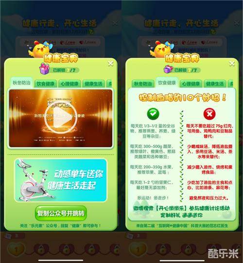 响应 “健康中国”号召,乐元素作为支持单位,与人民网·人民健康共同助力人民好医生2020“互联网+健康中国”第二届科普大赛,在旗下经典消除游戏《开心消消乐》发起了这次走步公益。现在起,关注“乐元素”微信公众号,就有机会赢取动感单车、空气炸锅、智能跑步机、健康大礼包等好礼,一起来参与吧~