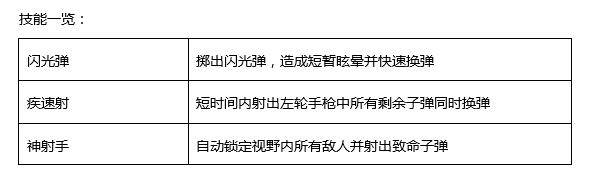 武器:克拉克的主武器是六发左轮手枪,射速慢,但单发伤害较高,可以在中近距离打出成吨的伤害。