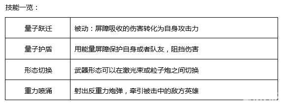 量子跃迁:被动技能。是和量子护盾以及激光束相关的技能,雷诺释放每释放一个量子护盾,能增加激光束的额外伤害,在不攻击敌人的情况下额外伤害会衰减,但是若一直保持攻击状态则不会衰减。量子跃迁是将雷诺从坦克增强为坦克+输出的实用技能。实战中,保持对队友释放护盾和保持对敌人的持续输出,能很好的提升雷诺的战斗力。