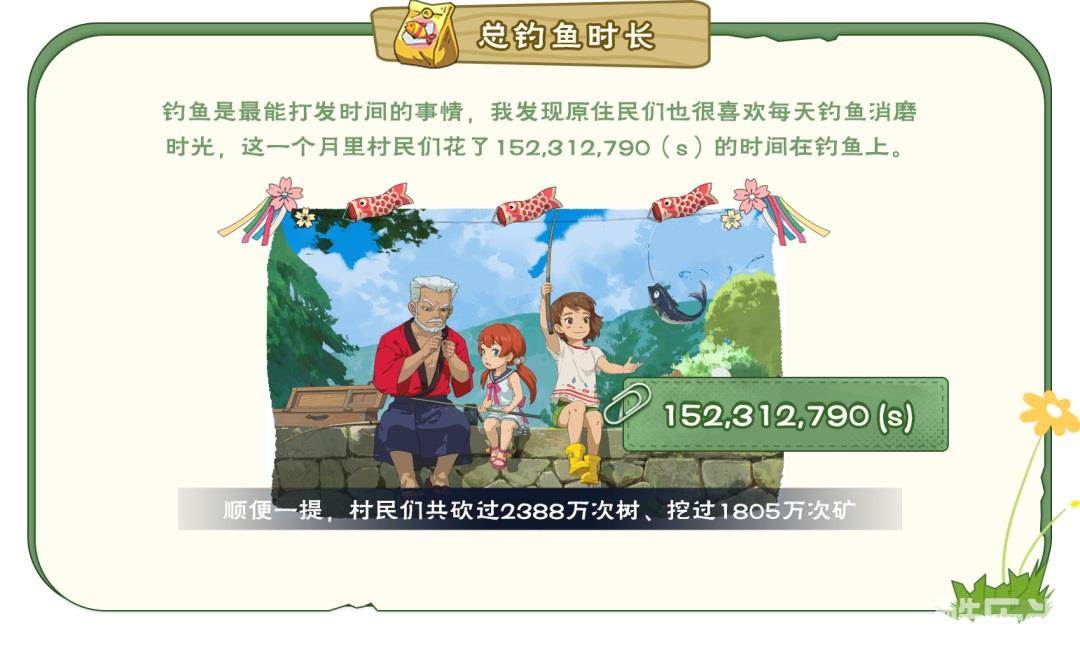 钓鱼、砍树和挖矿是小森村民的传统技能,一直以来就备受大家喜爱~测试期间,村民们总共花了多少慢吞吞的时光在钓鱼呢?森林里又有多少的树木和矿石成为了大家建设家园的原材料?