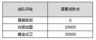 每个赛季开始后,战队成员可以通过各种战队活动获得个人活跃点,所有战队成员的活跃点总和则为战队活跃点。赛季结束后,将会根据战队活跃点的多少对战队进行评级,评级如下