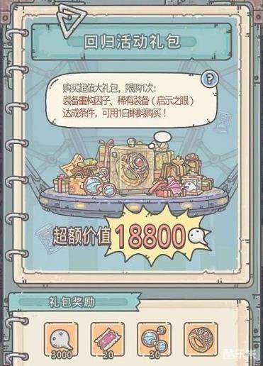 进入游戏主界面,点击下方标注位置进入商城界面,点击查看回归礼包。点击标注位置的问号,查看礼包规则。