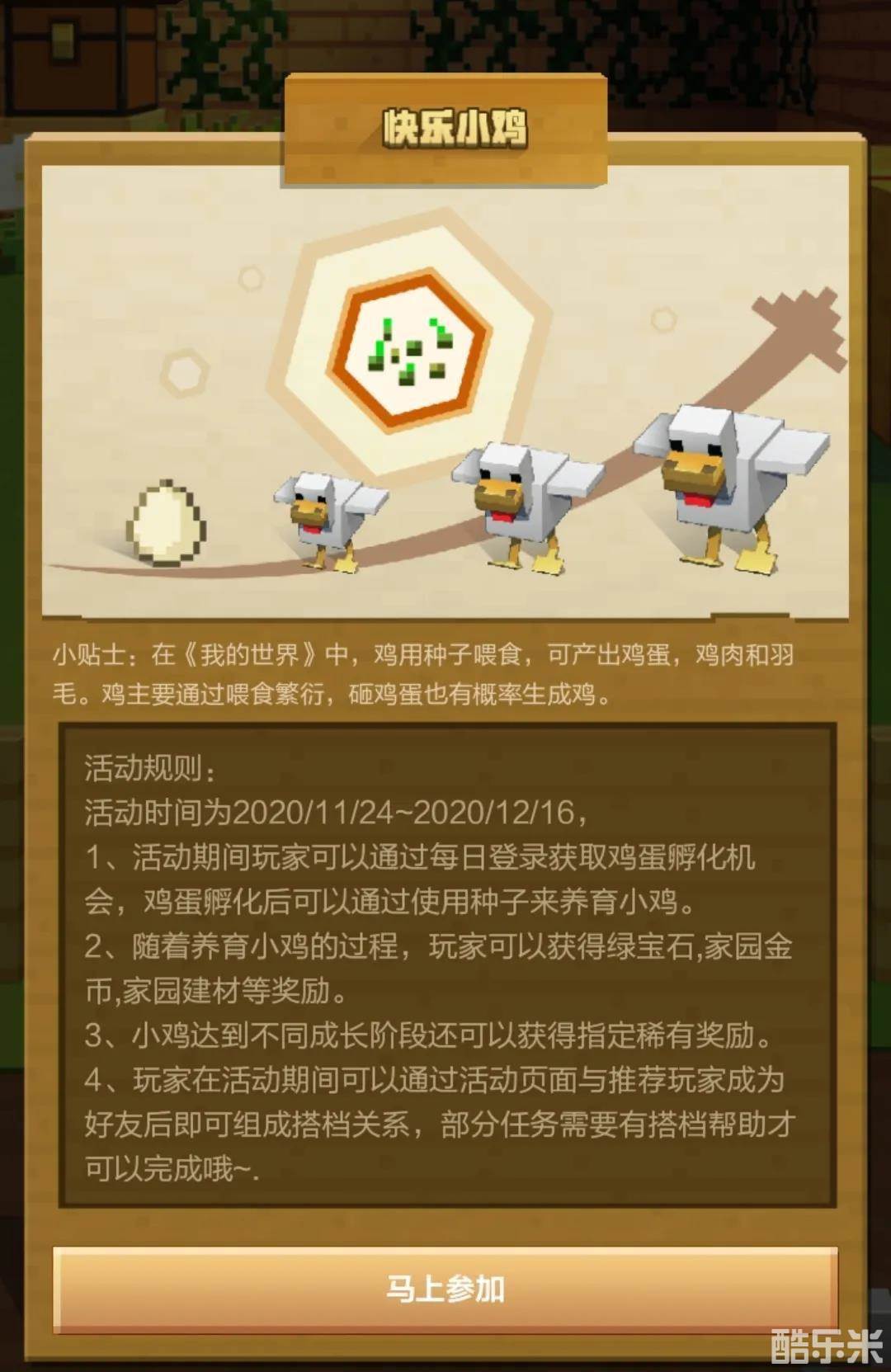 另外,更新还带来了全新的活动“快乐小鸡”,冒险家只要登录就可以领取鸡蛋!小鸡在喂养之后,还会掉落各种珍贵材料与稀有道具!建材、绿宝石和家具都在等着大家!还在等什么?赶快拿起手机,下载最新版本的《我的世界》,加入到感恩季的狂欢之中吧!