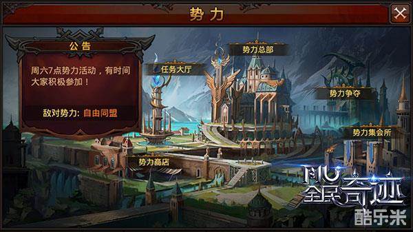 在《全民奇迹MU》5.0新版本中,玩家点击势力界面,即可进入势力争霸主界面,在这里玩家分别选择势力总部、任务大厅、势力争夺、势力商店、势力集会所等几个场所!在势力总部中,玩家可以查看到任职的势力职务的玩家。玩家想要获得职务,则需要在任务大厅中完成相应的任务,从而获取势力军衔,每周势力排行榜前三的玩家分别获得:势力大首领,势力元帅,势力督军三大职务,而势力军衔在每周一0点清空,在这里人人都有拥有职务的可能性,拥有职务的玩家将会获得大量的属性加成。