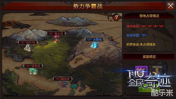 如果说玩家加入势力是为了保家卫国的梦想,那么势力争夺则一定是杀戮者的最佳梦想之地,玩家可以通过势力争霸战的主界面点击势力争夺,在这里玩家可以清楚的查看到势力争霸战界面左侧的沙盘地图,而在沙盘地图上耸立的分别是黑火城、冰霜城、白石城、绿茵城、高地城五大城池,而这五座城池则是玩家所属的三大势力中需要争夺之地!没做城池对应着一个战场,玩家点击相应的城池即可查看战场的占领信息。