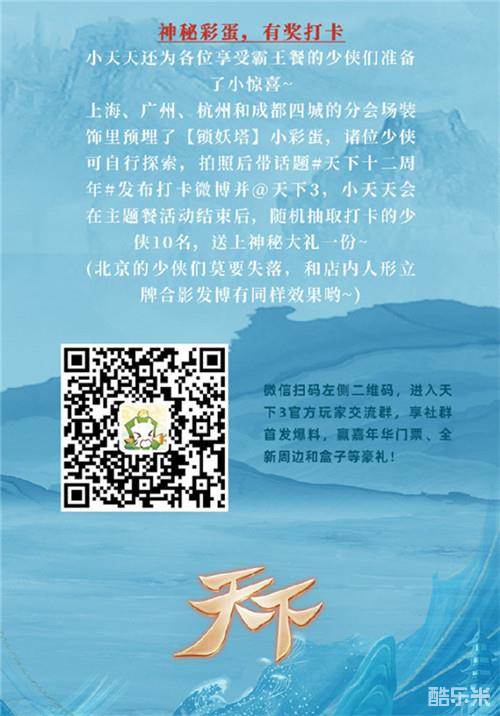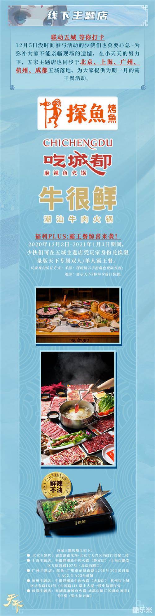 除了12月5日分会场的火锅与烤鱼之外,《天下》手游还为少侠们带来为期一月的霸王餐福利!本次霸王餐活动将从12月3日起在北京、上海、广州、杭州、成都五城举办,五家主题店除上文中提到的四家分会场门店之外,还包括北京霸蛮湖南米粉。展示手游角色登录界面即可兑换限量版天下专属双人/单人霸王餐!在店内寻找“锁妖塔”小彩蛋或与人形立牌合影,并拍照带话题#天下十二周年#发微博,还有机会获得一份神秘礼物哦!大荒牌霸王餐,你值得品尝!