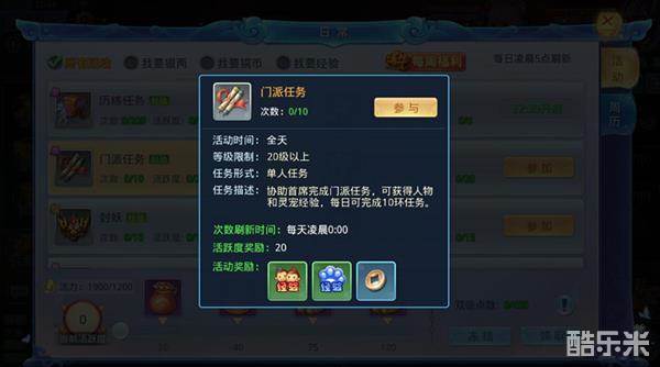 当玩家等级达到20级时,可在日常活动页面-门派任务中进行接取。门派任务分为十环,每完成一环门派任务都可获得丰厚的经验奖励,完成10环任务后更可获得荣誉徽章奖励。