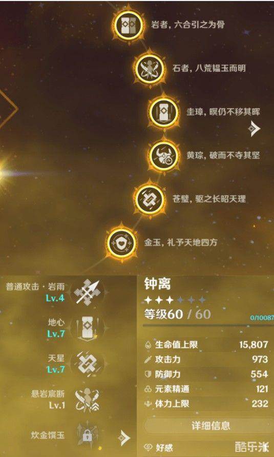 大招倍率想必不用多说吧,高额的倍率加上岩属性的伤害,在低攻击力情况下也是可以打出爆发伤害。后期如果圣遗物搭配合理,大招切出来打一下爆发伤害并且附带控制还是挺不错的!最主要钟离的大招只要40元素能量,几套技能后就能体验一次“地爆天星”真的是太爽了。