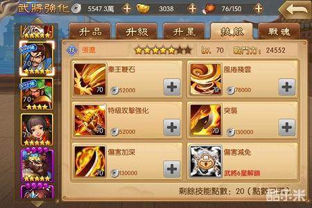 每个武将都设置有6个技能,其中初始技能4个,另外两个需要武将达到一定星等解锁。武将技能的升级需要足够的技能点和银两。